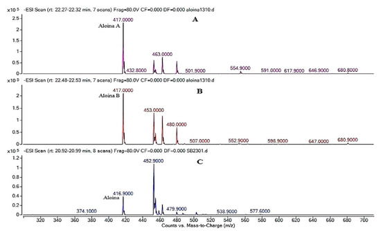 Mass spectrum of Aloin A (A), Aloin B (B), and EA (C).
