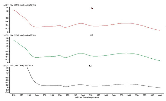 UV spectrum of Aloin A (A), Aloin B (B), and EA (C) with a wavelength of 350 nm.