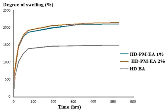 The polyacrylamide polymer absorbs water by the formation of hydrogen bonds, through the mechanism of osmosis [50], however, the higher the concentration of the polymer the stronger the bonds formed within the network and the less its degree of swelling. It was observed that the HD-PM-EA profile had a degree of swelling of 2000%, that was approximately 1.34-times greater than the HD BA (1491%) (Figure 4).