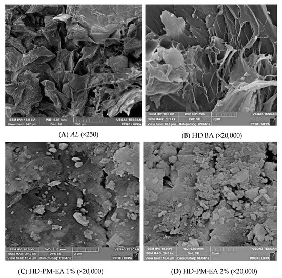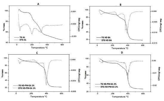 Thermogravimetric analysis was performed on samples AL, HD BA, and HD-PM-EA 1% and 2%. Five (5) mg of each sample was weighed in a platinum crucible and subjected to a temperature of 25–600 °C with a heating rate of 10 °C/min under a nitrogen atmosphere (N2) in a thermobalance Shimadzu TGA 50 (Kyoto, Japan) [36].