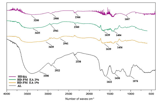 FTIR spectra of AL, 1% HD-PM-EA, 2% HD-PM-EA, and HD BA.