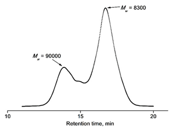 1H NMR spectra were recorded by an AC400 spectrometer (400 MHz) (Bruker, Billerica, MA, US) for solutions in chloroform. Dialysis was performed using CellaSep (Orange Scientific, Braine-l’Alleud, Belgium) dialysis bags with MWCO3500 D. The chromatographic analysis was carried out by a LC-20AD chromatograph (Shimadzu, Kyoto, Japan) equipped with a TSKgel G5000HHR column 5 μm, 7.8 mm × 300 mm (Tosoh Bioscience, Tokyo, Japan) and refractometric, LS and UV detectors. A LiBr solution (0.1 mol L−1) in DMF at 60 °C was used as a mobile phase, which prevents H-bonding in polymer solutions. The calibration was performed relative to poly(ethylene glycol) standards (Mw = 600–40,000). Chemicals and solvents (all Sigma Aldrich, St. Louis, MO, USA) were purified according to usual procedures.