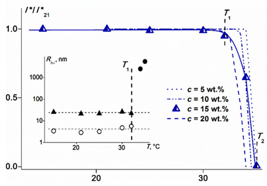 As can be seen from the inset in Figure 5, the radii of the fast and the slow modes in the 15 wt.% solution, in spite of the data spread, were nearly constant up to T1 = 32 °C, above which particles larger by an order of magnitude appeared. A drastic aggregation of particles began upon the isopropyl-2-oxazoline unit dehydration. The appearance of large objects led to the optical transmittance I* dropping to zero at T2 = 36 °C (Figure 5). Thus, T1 and T2 could be referred to as the onset and the end temperatures of the phase separation process.