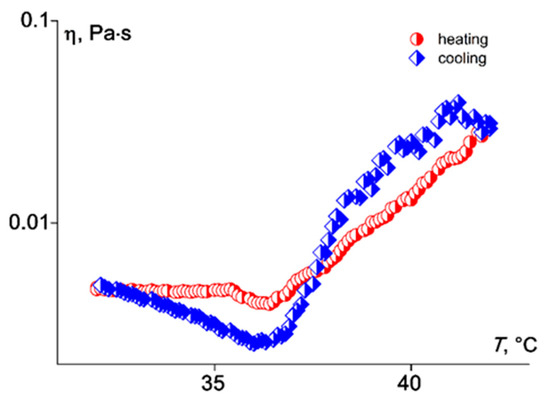 The temperature dependence of the dynamic viscosity η during the temperature sweep experiments in the heating-cooling cycle. The concentration is 15 wt.%; the shear rate γ = 100 s−1.
