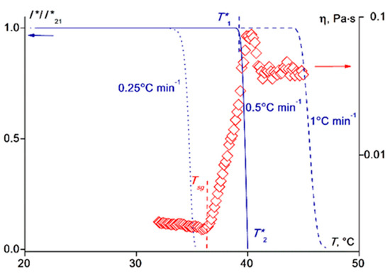 The transition temperatures Tsg found by the rheometry and the T1 determined by the turbidimetry for 15 wt.% solutions differ by 4 °C. This could be explained by the variety in experiment conditions: the rheometry was carried out at the heating rate of 0.5 °C per minute, while the temperature in the turbidimetry was changed stepwise with equilibration at each step. To clarify this phenomenon, additional measurements of the optical transmittance at the heating rates of 0.25, 0.5 and 1.0 °C·min−1 were carried out (Figure 7). One can see that increasing the heating rate resulted in the over evaluated temperature of the phase transition and a sharper drop in the solution transparency. This confirms the significance of the heating rate in the determination of phase transition temperature. However, the similar heating rate of 0.5 °C·min−1 in the rheology and the turbidimetry experiments resulted in a transparency drop at the temperature T1*, which is close to but higher than the sol-gel point (Figure 7). The visco-elastic behavior is probably more sensitive to the nano-sized aggregate formation [48] than the optical transmittance, which is insensitive to objects with dimensions below the diffraction limit [49].
