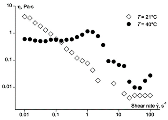 The viscosity vs. temperature curve has a slight negative slope below the Tsg (Figure 7), which is typical for solutions of linear polymers [50,51]. Above the Tsg, the viscosity curve takes a sharp positive slope. The solution viscosity rise was caused by the self-assembly of polymer particles into aggregates (see the inset in Figure 5) due to the thermo-induced hydrogen and hydrophobic interactions between particles. At the affinity of 40 °C, the curve passes the maximum and levels off. The viscosity drop is observed near 41 °C, but the nature of this phenomenon is not clear. The following plateau in the viscosity curve probably reflects approaching the equilibrium between the solvent viscosity decrease and the aggregate growth upon heating. Similar phenomena were observed for triblock copolymers based on poly(d,l-lactic acid-co-glycolic acid) and poly(ethylene glycol) [52].