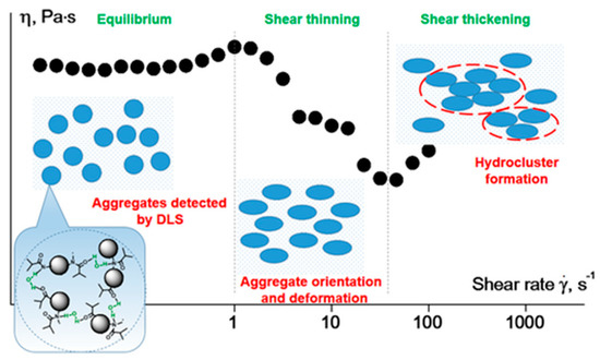 The flow behavior of the CL-PiPrOx solutions in water varied at different temperatures (Figure 9). At 21 °C, the solution flowed as a typical viscoelastic fluid displaying the shear thinning effect. Above the Tsg, the solution showed Newtonian flow within the shear rate ranging from 0.01 to 1 s−1, and the shear thinning within a 1–100 s−1 interval. At lower shear rates, the thermodynamic motion of the gel network, together with the solvation by water, held the system in a dynamic equilibrium with the flow shear. Near s−1, the viscosity grew and passed over a maximum that corresponded to the greatest strength of the gel. The flow with a shear rate above 50 s−1 deformed and oriented aggregates, which caused the viscosity decrease (the shear thinning). At yet higher shear rates, the hydrodynamic interaction—i.e., the more frequent particle collision—in the flow caused the aggregates’ density fluctuation which resulted in hydroclusters’ formation. This retarded the motion of the fluid and led to an abrupt increase in the viscosity (the shear thickening). There are two fundamentally different mechanisms of the hydroclusters’ formation proposed for colloidal systems: jamming when the transient physical network appears between particles and cross-linking when the network junction points’ lifetime is long—for example, the hydrogen bonding between particles [42,53]. The hydrophobic interaction could also cause the supramolecular structure formation, but much weaker [54]. The shear thickening observed at high shear rates resulted from the jamming mechanism, i.e., the orientation and the deformation of aggregates of particles and consequent formation of transient hydroclusters (Figure 10). Gelling via the jamming mechanism was reported for a variety of associative polymers and described in a comprehensive review by Chassenieux and co-workers [55].
