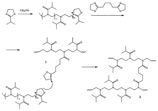 The synthesis of linear (1) and cross-linked (2) poly-2-isopropyl-2-oxazoline.