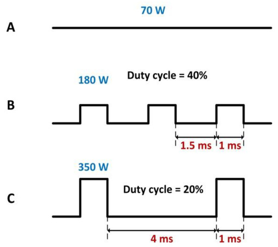 Temporal profiles of the three laser working modes: (A) The continuous wave (CW) mode with an output power of 70 W. (B) The pulse mode with a repetition rate of 400 Hz, pulse width of 1 ms, and pulse peak power of 180 W. (C) The pulse mode with a repetition rate of 200 Hz, pulse width of 1 ms, and pulse peak power of 350 W. For different laser modes, the laser source had the same average output power of 70 W.