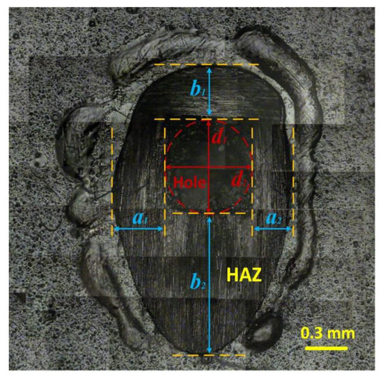 A metallurgical microscope was used to observe the surface morphologies of the drilled specimens. In Figure 3, the region of ablated fibers (marked with red dotted line) was the entrance hole, and the region of fibers that protruded from the epoxy matrix was the surface HAZ [6,9,19]. For the same laser parameters, the sizes and shapes of the entrance holes were almost invariable. The shape of the entrance hole approximated the shape of a standard circle. However, due to the plain-woven structure of the carbon fiber cloth, the composite surface had an anisotropic heat conduction. Therefore, the sizes and shapes of the surface HAZs might significantly change with the laser irradiation positions on the specimen surface. In order to accurately describe the change rule of the surface morphologies, there were no less than 20 drilled holes tested for every laser condition. Additionally, unified calculation methods were provided for the entrance hole diameter () and the surface HAZ width (). The and the could be calculated as follows: