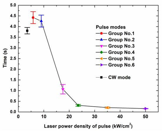 The mean penetration times of the laser drilling through the target specimen with different laser modes are shown in Figure 4. For each laser mode, no less than seven samples were tested. It was revealed that the mean penetration times in the ms pulse modes were less those that in the CW mode, when the peak power densities of the laser pulses were much larger than the average output power density of 3.5 kW/cm2. In the ms pulse modes, the penetration time increased with the decrease of the peak power density and increase of the pulse frequency. For Group No. 1 and Group No. 2, for which the peak power densities were similar to the mean output power density, it could be seen that the penetration time was greater than that of the CW mode.