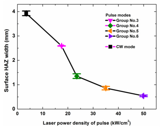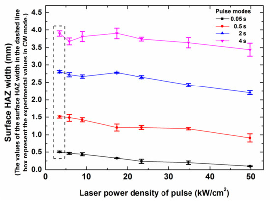 Surface heat affected zone (HAZ) width dependence on the laser peak power densities of different laser modes with different laser irradiation times. The laser parameters for the different laser modes are shown in Table 2.