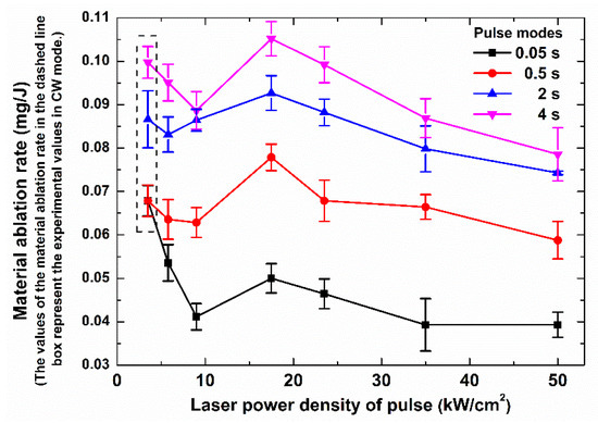 Considering the thermal degeneration of the material mechanical strength caused by the rise of the temperature [37], the strength threshold of the mechanical erosion of the composite material decreased with the increase of the temperature. Therefore, a higher laser peak power density could lead to a larger internal gas pressure in the composite at a higher temperature and the internal gas pressure caused more materials, which included the carbon fibers and the matrix, to experience mechanical erosion. It could be concluded that the laser mode, which had a higher laser peak power density, could improve the efficiency of the laser drilling. This could explain the dependence of the laser penetration time on the laser power density for the different laser modes described in Section 3.1 very nicely.