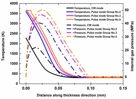 Temperature profile and internal gas pressure profile in the thickness direction for different laser modes with a laser irradiation time of 1 ms. The laser parameters for the different laser modes are shown in Table 2.