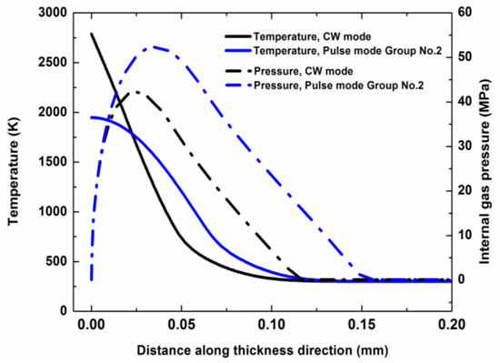 Temperature profile and internal gas pressure profile in thickness direction for different laser modes with a laser irradiation time of 2 ms. The laser parameters for the different laser modes are shown in Table 2.