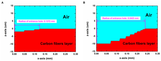 For Section 4.2, to accurately predict the entrance hole diameter and the surface HAZ, a new geometric model was proposed, as shown in Figure A2. In this model, the resin matrix layer with a 0.1 mm thickness and the carbon fibers layer with a 0.06 mm thickness were separated. The Point o (0,0) was at the interface of the two layers, as shown in Figure A2.