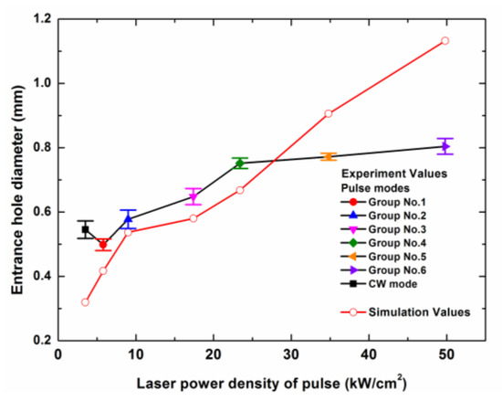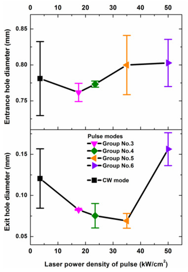 The entrance hole diameter increased with the increase of the laser irradiation time in all of the laser modes. When the peak power density of the pulse laser was higher, the entrance diameter of the drilled hole achieved stability more quickly. The maximum entrance diameter for different pulse laser modes increased with the increase of the peak power density. When the laser irradiation time was long enough, the entrance hole diameter of the CW laser mode could exceed those of some of the pulse laser modes.