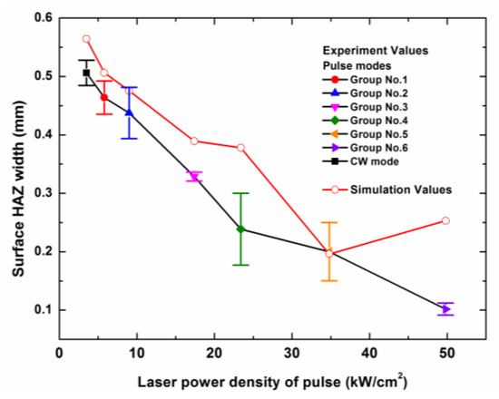 Dependence of the surface heat affected zone (HAZ) widths of the experimental values and the simulation values on the different peak power densities of different laser modes with a laser irradiation time of 0.05 s. The laser parameters for the different laser modes are shown in Table 2.