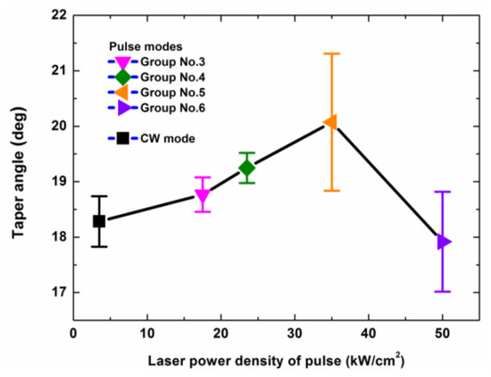 The tapers of the drilled holes that were made using different laser modes are shown in Figure 15. From Figure 15, it can be seen that the maximum difference of the tapers was less than 4.5°. Therefore, the drilled holes could be considered similar.