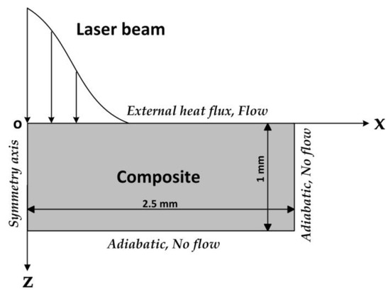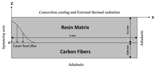This model only considered the entrance hole diameter and the surface HAZ width, so the pyrolysis process of the polymer resin could be neglected. Therefore, the numerical model only needed to use the Heat Transfer Module of COMSOL. Additionally, because the epoxy resin was transparent for the NIR laser [8,38] and the absorption depth of the 1064 nm laser inside of carbon fiber varied in the range of 74 to 270 nm [39,40], the laser energy that was absorbed at the upper surface of the carbon fibers layer was considered in this model. Thus, the boundary conditions could be written as follows: