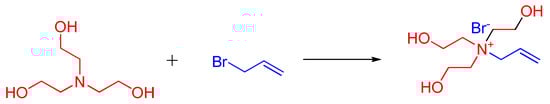The preparation of THAAB was based on a previously reported method [,] shown in Figure 1. Triethanolamine (0.20 mol), allyl bromide (0.20 mol), and ethanol (150 mL) were placed in a round-bottom flask equipped with a reflux condenser and refluxed for 24 h with magnetic stirring at 50 °C. After cooling to room temperature, the solution was concentrated under reduced pressure and redissolved in ethyl acetate and ethanol (ethyl acetate: ethanol ratio 7:3). The product was isolated in high yield as rod-like crystals or white powder after being left at room temperature for 24h. Yield: 94.3%. 1H NMR (400 MHz, D2O): 5.62–5.75 (m, 1H, CH=C), 4.89~5.07 (m, 2H, C=CH2), 3.75~3.76 (d, 6H, CH2–O), 3.60 (t, 2H, –CH–C=C), 3.33 (t, 3H, –OH), 3.04~3.06(t, 6H, N–CH2–C–OH); IR (KBr), /cm–1: 3360, 2920, 1630, 1400, 1080, 900, 520.