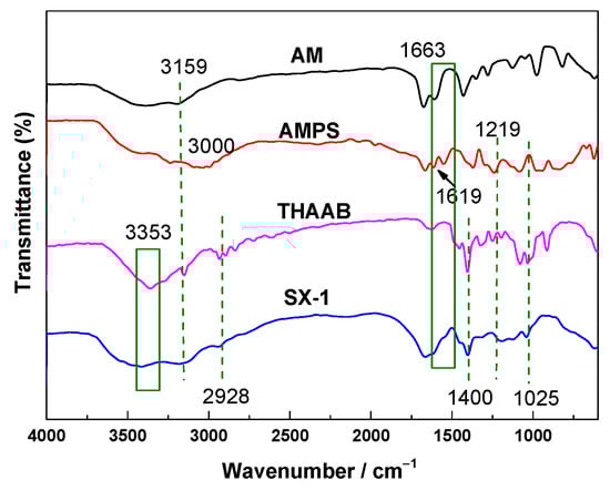 FT-IR spectra were recorded using a WQF-520 Fourier transform infrared spectrometer over a wavenumber range of 4000–400 cm−1. Figure 3 shows the FT-IR spectra of AM, AMPS, THAAB and copolymer SX-1.