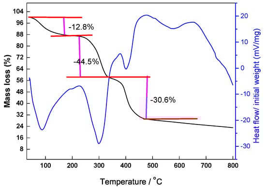 Thermogravimetric (TGA) differential scanning calorimetry (DSC) was utilized to investigate the thermal stability of SX-1. The thermal gravimetric curve displayed four stages of weight loss, which are shown in Figure 5. The first stage—with a mass loss of 12.8 mass % in the temperature range 40–225 °C—was due to the evaporation of intramolecular and intermolecular water, which was strongly hydrogen-bonded with oxygen atoms and amide groups of SX-1. The second stage took place in the temperature range 225–341 °C with a loss of 44.5 mass (%), and was probably mainly due to the decomposition of amide and quaternary ammonium groups. The third one occurred in the 341–475 °C temperature range with a prodigious loss of 30.6 mass (%), which can be mainly ascribed to the decomposition of SX-1, due to the degradation of C–C bonds in the main chain [].