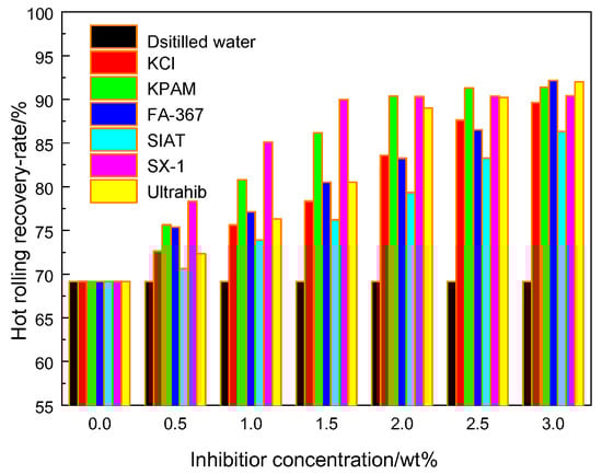 The recovery rate of shale in distilled water was 69.16%, indicating the comparatively high degree of dispersion of Longmaxi shale. The recovery rates of shale increased as the inhibitor solution concentrations were gradually increased. For each concentration, KPAM, Ultrahib and SX-1 demonstrated excellent shale hydration inhibition properties.
