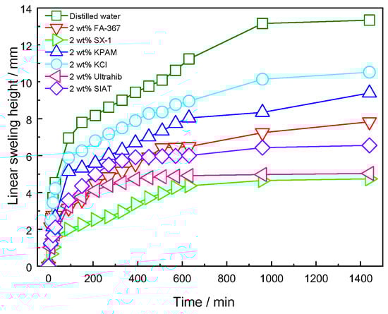 In this part, linear swelling tests of an Na-MMT artificial core exposed to distilled water and aqueous solutions of different shale inhibitors were studied at room temperature, as shown in Figure 7.