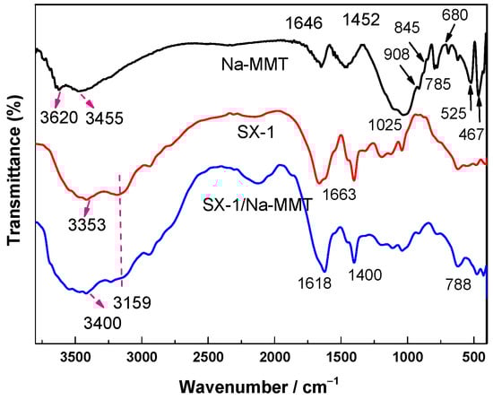 FT-IR spectroscopy is a sensitive technique for analyzing the interaction type, configuration, and local environment of Na-MMT modified by an intercalating agent. The adsorption of SX-1 on Na-MMT was confirmed by FT-IR spectra in this work, as shown in Figure 8 below.