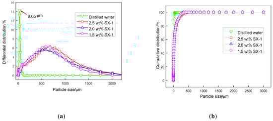 SX-1 at certain concentrations was added into WBDFs and stirred for 2 h. Particle size analysis was then performed using a laser diffraction technique (HORIBA, Kyoto, Japan). The operating temperature was 25 °C and the circulation speed was 2000 r/min. The repeatability error was less than 3%, the accuracy error was less than 3%, the frequency of the ultrasonic system was 40 Hz, 70 W, and the stirring speed was 100–475 rpm.