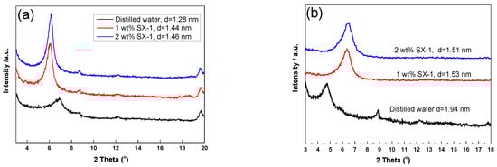 XRD patterns shows the dry and wet X-ray diffraction patterns for the d(001) diffraction peaks of Na-MMT and Na-MMT/SX-1. As shown in Figure 10a, it can be seen that the interlayer spacing of dry Na-MMT is 1.28 nm, and those of Na-MMT treated with 1.0 wt % and 2.0 wt % SX-1 are 1.44 nm and 1.46 nm, respectively. The diffraction bands are shifted to a lower diffraction angle, corresponding to a higher interlayer distance, indicating the entrance of copolymer SX-1 into the Na-MMT crystal layer. For the wet composite (Figure 10b), due to the hydration expansion of Na-MMT, the spacing distance of wet clay has increased from 1.28 to 1.94 nm compared with that of dry clay, indicating that the interlayer ion was sodium ion []. After treatment with SX-1, it was found that the angle shifted to a higher angle, and the interlayer spacing decreased greatly. The combined effect of water outflow and SX-1 entry was the reduction of interlayer spacing. The results showed that SX-1 could enter the internal layer and inhibit the hydration swelling of Na-MMT.