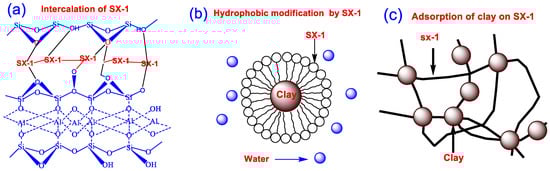 Inhibition mechanism analysis of SX-1. (a) Intercalation of SX-1. (b) Hydrophobic modification by SX-1. (c) Adsorption of clay on SX-1.