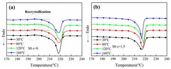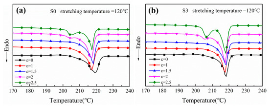 The DSC curves of PA612 films at the strain of (a) ε = 0 and (b) ε = 1.5.