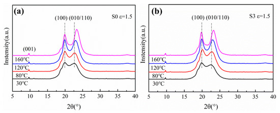 The WAXD curves of (a) PA612 and (b) PA612/SiO2 films uniaxially stretched at different temperature.