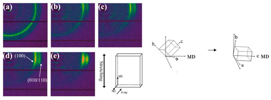 Stretching not only affects crystallization and crystal orientation of nylons, but also their macroscopic properties [13,14,15]. Liu prepared uniaxial and biaxial stretched PA6-66/MMT composite films [16]. After stretching, the crystallinity of composite films was enhanced and the transition of β phase to α phase was observed. The mechanical strength of composite films is highly improved and it is mainly affected by the stretching ratio. Uniaxial and biaxial stretching led to decreased transmittance and increased haze in the PA6-66/MMT films and the thermal shrinkage of the films increased with increasing stretching ratio.