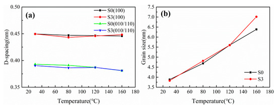 The interplanar spacing (d-spacing) and grain size of the stretched films as a function of stretching temperature and stress are illustrated in Figure 7 and Figure 8, respectively. The d-spacing of (010/110) plane in stretched PA612 and PA612/SiO2 films decreases with increasing of stretching temperature. This can be accredited to the slip, deflection, and recombination of crystal lamellae during stretching at high temperature [36,37]. As shown in Figure 8, compared with the neat PA612 films, the PA612/SiO2 films exhibit an analogous tendency in the d-spacing of the two diffraction planes and the grain size of the spherulites. It implies that the addition of SiO2 plays an insignificant role in the crystal phase and structure transition of PA612 during stretching. The grain size of PA612 was apparently affected by stretching temperature and strain, and it is climbing with the stretching temperature increases. Hence, high stretching temperatures conduce to complete the grains during stretching. After stretching, the grain size declined drastically and remained constant after ε = 1.5. The addition of SiO2 led to a minished the grain size, indicating the grain refining effects of SiO2.