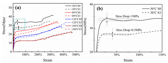 Figure 9 demonstrates the stress-strain curves of S0 and S3 at different temperatures. It can be found that the stretching temperature and the presence of SiO2 both affect the yield behavior of the films. As increasing of stretching temperature, the yield stress gradually decreases and the yield point disappears as the temperature is higher than 80 °C. The presence of SiO2 leads to the diminution in the yield stress, as well as reduces the stress drop (Figure 9b) at the stretching temperature of 30 °C. Yalcin et al. revealed that the necking of the samples is proportional to the stress drop [33]. Hence, the incorporation of SiO2 can alleviate film necking during stretching. Meanwhile, the samples stretched at 30 °C exhibit a typical stress-strain behavior of typical semi-crystalline polymers. It consists of elastic region, yielding, strain-softening, necking, and orientation hardening stages. Nevertheless, as the stretching temperature exceeded 80 °C, the yielding and strain-softening region disappear and the curve transform from the elastic region to the orientation hardening directly without necking stage. Generally, the nonreactive SiO2 serves as a plasticizer within the matrix, while the reactive SiO2 present a reinforcement effect or a plasticizing effect due to its processing method and the reactivity of the grafted groups on SiO2 surface [22,23,38]. As shown in Figure 9, the yielding point of Sample S3 was lower than that of Sample S0, and it is difficult to explain why the yield stress of S3 samples are lower than S0 samples. On the one hand, it couldn’t attribute to the plasticizing effect under these conditions, because the peak of loss factor of S0 is higher than S3 and the glass transition temperature of S0 is lower than S3 (Figures 11 and 12). On the other hand, it is not the reason for the changing of crystal structure; the SiO2 particles diminished the grain size (Figure 8), and the yield stress of S3 should be higher than S0. This phenomenon should be investigated further. As the stretching temperature increased, the stress-strain curves of S0 and S3 tend to overlap each other, indicating that the effect of SiO2 on the matrix is negatively related to the mechanical properties at high stretching temperature.