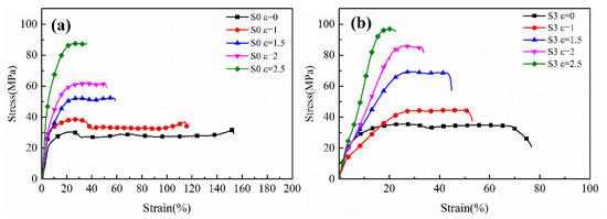 The stress-strain curves of the stretched PA612 and PA612/SiO2 films with different strains are shown in Figure 10. Herein, all samples were stretched at room temperature (25 °C). The stretched PA612 films still show yielding and strain-softening at the ε = 0 and ε = 1, but disappeared when the films were stretched to high strain and the stretched PA612/SiO2 samples exhibit no significant yielding or strain-softening region. Combined with Figure 6 and Figure 10, it can be concluded that the fracture strength of the films after stretching are positively correlated with the orientation of the crystal. Moreover, as the stretching strain increasing, the crystal orientation turn more obvious, the elongation at break decreases and the fracturing strength increases dramatically, and this is related to the orientation degree of crystal and the reorientation of polymer chains. This could be due to the development of fibrous crystals at high strain after the dislocation, deflection, and orientation of the crystals [39]. The movement of the fibrous crystals and the amorphous region is strongly hindered after sufficient stretching with high strain. The molecular chains in the amorphous region were highly oriented. The followed forced stretching would bring about the extraction and straightening of molecular chains, and the completed crystals are damaged into smaller crystallization units under stress [36]. A part of the molecular chains were extremely stretched before fracturing [40,41]. As a result, for the PA612 samples, the fracture strength increases and the elongation at break decreases as increasing of stretching strain, where the maximum fracture stress of stretched films was three times than that of unstretched films and the elongation at break is reduced from 160% to 35%. These changes can be attributed to the hindered movement of molecular chains in the amorphous regions and highly oriented fibrous crystals [35]. The PA612/SiO2 samples exhibit similar trends of fracture stress and elongation at break, but they have higher fracture stress and lower elongation at break. This is because the SiO2 hinders the movement of molecular chains when the films were stretched.