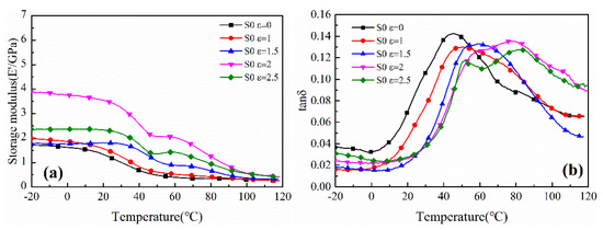The storage modulus and tanδ as a function of temperature curves of uniaxially stretched PA612 and PA612/SiO2 films are shown in Figure 11 and Figure 12, respectively, from which we can obtain the glass transition temperature (Table 3) and investigate the toughness-rigidity transition of the films. Indeed, the glass transition temperatures were highly improved. As increasing of stretching strain, the storage modulus increases accompany with the decreases of the loss factor peak and the monotonically elevated glass transition temperature. It indicates that the increased strain would lead to enhanced rigidity and reduced toughness. Moreover, the glass transition temperature and storage modulus of PA612/SiO2 films were higher than that of PA612 films regardless of the stretched or unstretched films and this is consistent with PA6/SiO2 composites where the SiO2 particles improved the glass transition temperature and storage modulus of PA6 [38]. In the PA612 samples, the tanδ vs. temperature curves show two peaks when the ε = 2 and ε = 2.5 from Figure 11b, which would help to confirm that the molecular chains were extracted from the stretching-induced lamellae fragments from spherulites. However, this phenomenon was not shown in stretched PA612/SiO2 films.