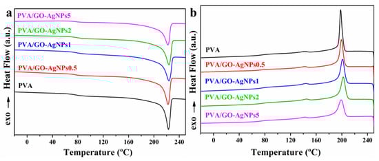 where ΔHm is the enthalpy of fusion of the PVA and PVA/GO–AgNPs nanocomposites, ΔH0m is the enthalpy of fusion of the 100% crystalline PVA (141.932 J/g) [44], and ϕ is the weight fraction of filler in the composite. The crystallinity of nanocomposites remained constant with the incorporation of GO–AgNPs into PVA. Figure 4 shows the corresponding thermograms.