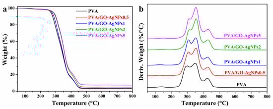 (a) TG and (b) DTG curves of neat PVA and PVA/GO–AgNPs nanocomposites in nitrogen.