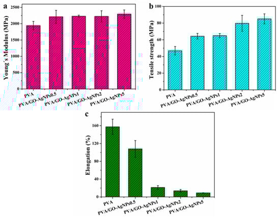 Tensile properties of neat PVA, and PVA/GO–AgNPs nanocomposites. (a) Young´s modulus; (b) tensile strength; (c) elongation at break.