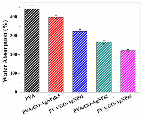 Previous studies have revealed that graphene and GO decorated with AgNPs based PVA nanocomposites show a considerable improvement in water resistance compared to the neat polymer matrix [25,52,53]. The water uptake of pure PVA and PVA/GO–AgNPs nanocomposite films is displayed in Figure 7. The presence of GO–AgNPs results in a lower absorbed water content. A higher GO–AgNPs content leads to a lower amount of water uptake. A reduction of absorbed water between 10% and 50% is observed after the incorporation of GO–AgNPs into PVA. The hydrophilic character of PVA is responsible for the high-water absorption of this polymer. Water resistance depends on the interactions between water and polymer chains. The stronger the interfacial adhesion between the PVA and the hybrid, the less hydrophilic groups can interact with water. Therefore, the enhancement of water resistance can be attributed to interactions between the polymer and the hybrid through strong hydrogen bonds. In addition, a constrained polymer region is generated resulting from hydrogen bonding that prevents the water absorption [54,55].