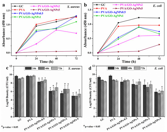 Absorbance of (a) S. aureus growth curves and (b) E. coli growth curves after different times of exposure to PVA/GO–AgNPs composite films. Viable counts of (c) S. aureus and (d) E. coli.
