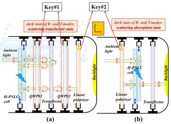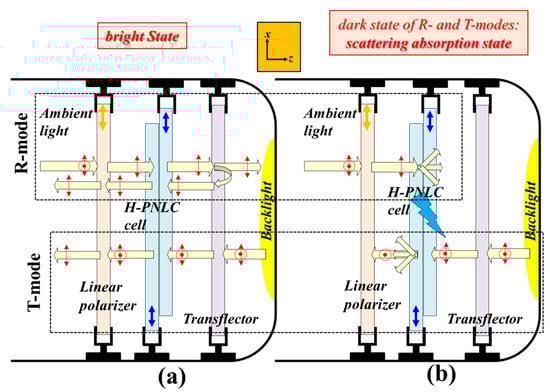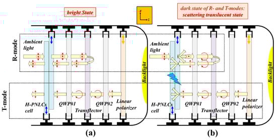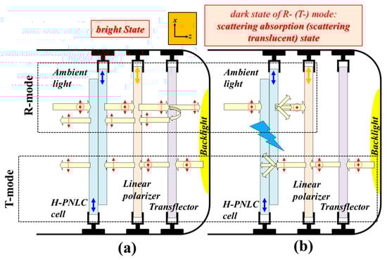 Transmissive LC display (T-LCD) is a common technology that has been widely applied to various electronics globally. A backlight unit is assembled into a T-LCD to provide a light source for displaying images. The main drawback of T-LCDs is that the contrast ratio (CR), which is defined as the ratio of the luminance of output light in the bright state to that in the dark state, is relatively low under strong ambient light due to undesired glares. However, reflective LCDs (R-LCDs), which use ambient light as the sole light source to display images, possess relatively high CRs under strong ambient light but are inoperative under dim ambient light. To realize LCDs with high CR under strong and/or dim ambient light environments, several types of transflective LCDs (TRLCDs) are developed. A pixel region of a common TRLCD is usually divided into transmissive (T-) and reflective (R-) regions to work as T- and R-modes, respectively [,,,,,,,,,,]. Figure 1 presents the structures of a common scattering-type TRLCD (ST-TRLCD), which consists of two quarter-wave plates (QWP#1 and QWP#2), a homogeneous PNLC (H-PNLC) cell, a linear polarizer, and a transflector []. One pixel of an ST-TRLCD, which does not need to be divided into two regions, works as the T- and R-modes simultaneously. The transmissive axis of the linear polarizer is along the x-axis. LPL with its polarization direction parallel to the x-axis remains unchanged after passing through the QWP#1 and QWP#2 when the optical axes of the QWP#1 and QWP#2 are perpendicular to each other, and the angle made between the optical axis of the QWP#2 and the polarization direction of the x-LPL is 45°. LCs in an H-PNLC cell are along the x-axis, allowing the cell applied with a suitable electric field to scatter LPL with its polarization direction parallel to the x-axis. The operation of the common ST-TRLCD (Figure 1) requires only one polarizer, so it can achieve high brightness. The bright states of the T- and R-modes of the common ST-TRLCD (Figure 1a) are realized in the absence of electric fields applied to the H-PNLC cell. Figure 1b illustrates that when the H-PNLC cell is applied with a suitable electric field, the T- and R-modes approach their scattering-translucent states, which are not good dark states. Thus, the CR of the common ST-TRLCD depicted in Figure 1 is insufficient for practical applications. Moreover, the use of the QWP close to the linear polarizer results in a parallax problem in the common ST-TRLCD []. Overall, to enhance the CR and to solve the parallax problem caused by QWPs, we redesign the optical components and remove the two QWPs based on the configuration of the common ST-TRLCDs.