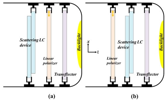Configurations of (a) ST-TRLCD#1 and (b) ST-TRLCD#2. Both comprise one scattering liquid crystal (LC) device, one linear polarizer, and one transflector. The main difference in configuration between both is the arrangement of the linear polarizer and the scattering LC device. Orange arrows plotted in the linear polarizers represent their transmissive axes.