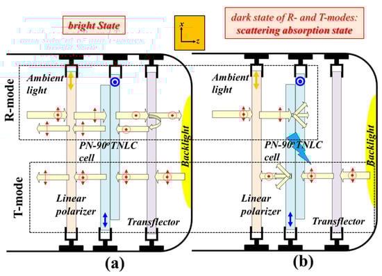 Referring to the R-mode exhibited in Figure 5b, the unpolarized ambient light is linearly polarized to x-LPL after passing through the linear polarizer. The x-LPL is then scattered by the PN-90° TNLC cell applied with a suitable electric field. The scattered light is partially reflected by the transflector, thereby losing half of its intensity. The scattered light reflected by the transflector having component of y-LPL is subsequently scattered by the PN-90° TNLC cell applied with the suitable electric field, and then partially absorbed by the linear polarizer; the scattered light reflected by the transflector having component of x-LPL partially passes through the PN-90° TNLC cell, and is absorbed by the linear polarizer due to polarization rotation of PN-90° TNLC cell; the detailed description of the scattered light exiting the PN-90°-TNLC cell is not drawn in Figure 5b. This is the dark state of the R-mode. Referring to the T-mode displayed in Figure 5b, the unpolarized backlight is first partially reflected by the transflector, thereby losing half of its intensity. The PN-90° TNLC cell applied with a suitable electric field scatters y-LPL; at the same time, the x-LPL can partially transmit the PN-90° TNLC cell, and its polarization direction is rotated 90° to become y-LPL after passing through the PN-90° TNLC cell. The y-LPL and the scattered light exiting the PN-90° TNLC cell applied with a suitable electric field are fully and partially absorbed by the linear polarizer, respectively, to approach the dark state of the T-mode.