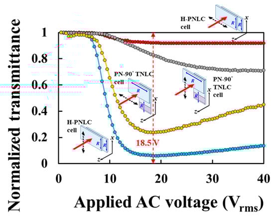 Figure 6 depicts the normalized transmittance as a function of the applied AC voltage (T–V) curves of the PN-90° TNLC cell and the H-PNLC cell. The probe beam was a He–Ne laser in two different LP states. The distance between the photodetector and the LC cell was set to be approximately 15 cm. The red and gray (blue and orange) curves in Figure 6 plot the T-V curves using a LP He–Ne laser with its linear polarization directions, marked as black dashed double-headed arrows, which were perpendicular (parallel) to the rubbing directions on the entrance planes of the substrates of the H-PNLC and PN-90° TNLC cells, respectively. All He–Ne lasers, whose propagation directions are plotted by red solid arrows, traveled along the −z-axis. No analyzer was placed in front of the photodiode.