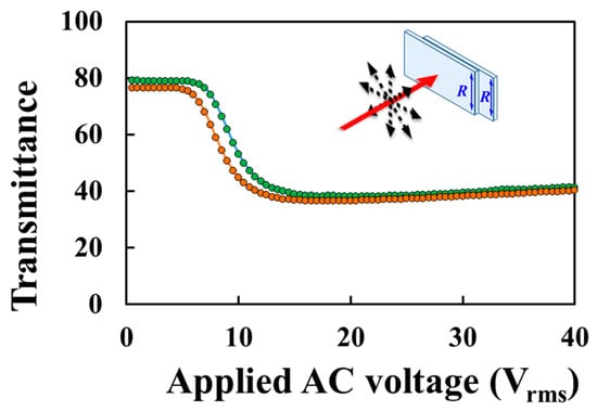 Figure 7 plots the hysteresis of the T–V curve of the H-PNLC cell measured using an unpolarized He–Ne laser (the red arrow shows the propagation direction, and the four black double-headed dashed arrows depict the unpolarized state). The green and orange curves represent the T–V curves obtained by increasing and decreasing the applied AC voltages stepwise, respectively. The hysteresis of the H-PNLC cell could be eliminated by doping specific dopants into the mixture [,]. The transmittance of incident unpolarized light passing through the H-PNLC cell without any applied voltage is ~79%, as illustrated in Figure 7. To enhance the maximum transmittance, the substrates can be coated with antireflection films []. Figure 8a,b shows the microscopic images of the H-PNLC cell applied with 18.5 Vrms under the configurations consistent with those of the red and blue curves plotted in Figure 6 using a separate experiment, respectively. The intensities of the backlight sources of the transmissive polarized optical microscopy for capturing the two images are the same. The brightness of Figure 8b is darker than that of Figure 8a due to light scattering. The observation corresponds to the normalized transmittances of red and blue curves in Figure 6 when the applied voltage is 18.5 Vrms.